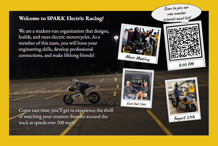 Welcome to SPARK Electric Racing! We are a student-run organization that designs, builds, and races electric motorcycles. As a member of this team, you will hone your engineering skills, develop professional connections, and make lifelong friends! Come race time, you’ll get to experience the thrill of watching your creation thunder around the track at speeds over 200 mph!