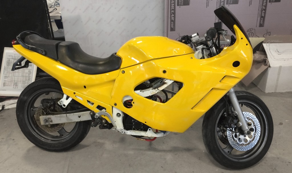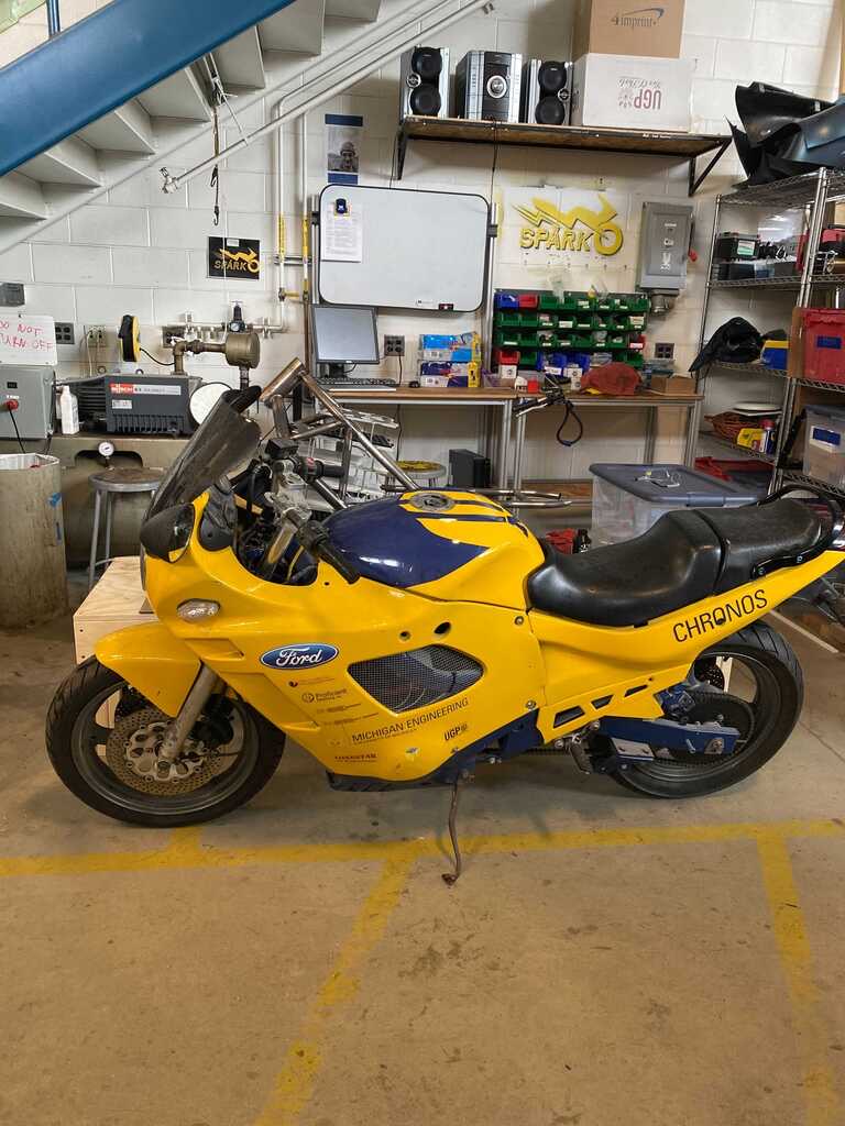 Our very first bike, a 1997 Suzuki Katana purchased in 2013. Built for the drag strip, running a 48v lithium battery and twin DC electric motors, this bike was a true first of its kind and a stepping stone for Spark Electric Racing. Chronos broke two world records on its debut run: